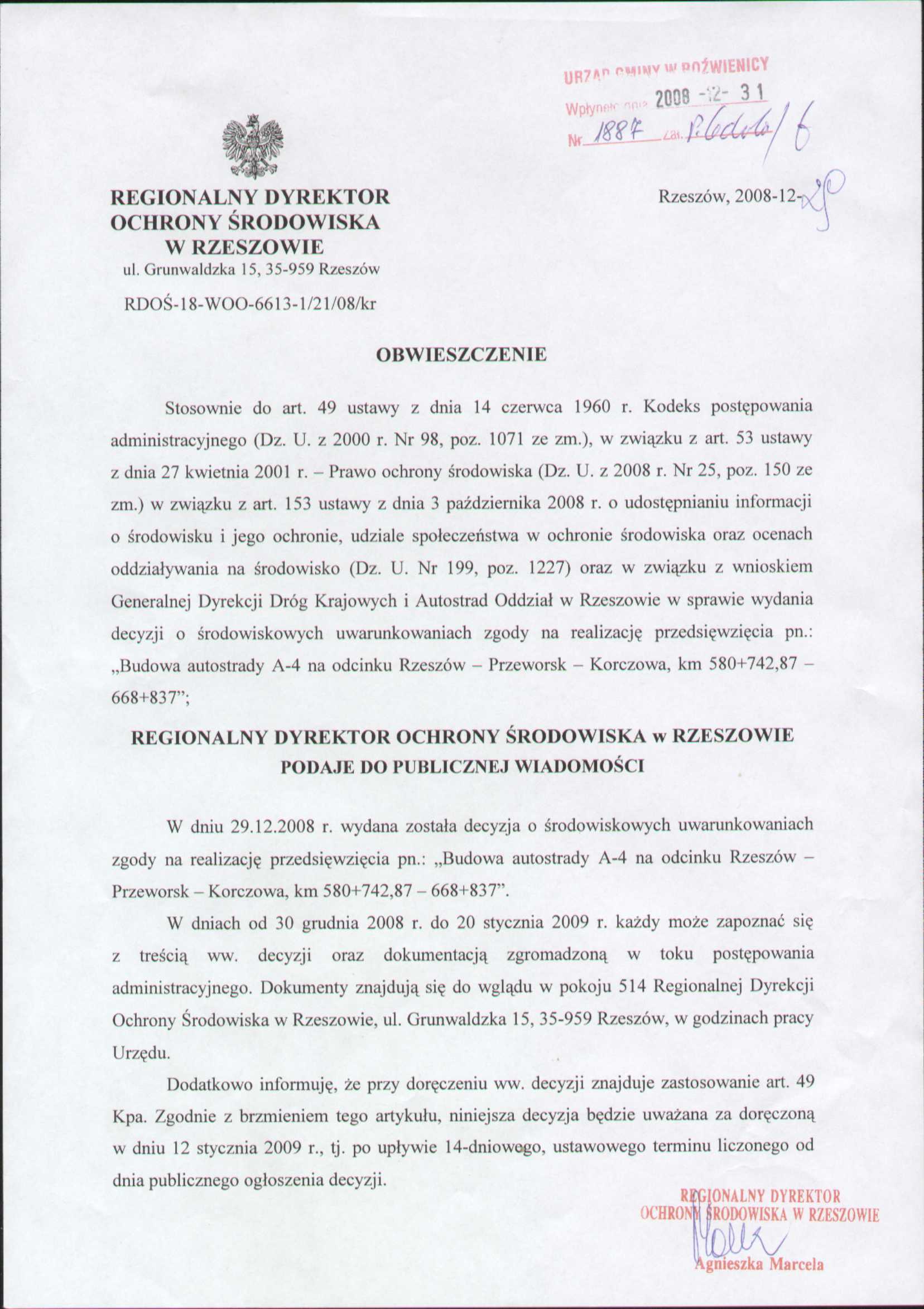 | Nazwa pozycji: | Obwieszczenie Regionalnego Dyrektora Ochrony Środowiska w Rzeszowie |