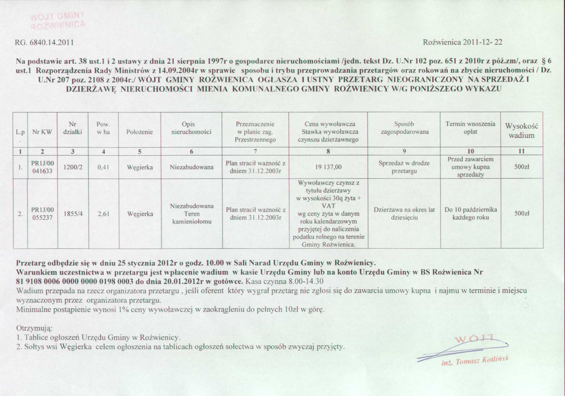 | Nazwa pozycji: | Ogłoszenie o przetargu ustnym na sprzedaż i dzierżawę nieruchomości mienia komunalnego gminy Roźwienica |