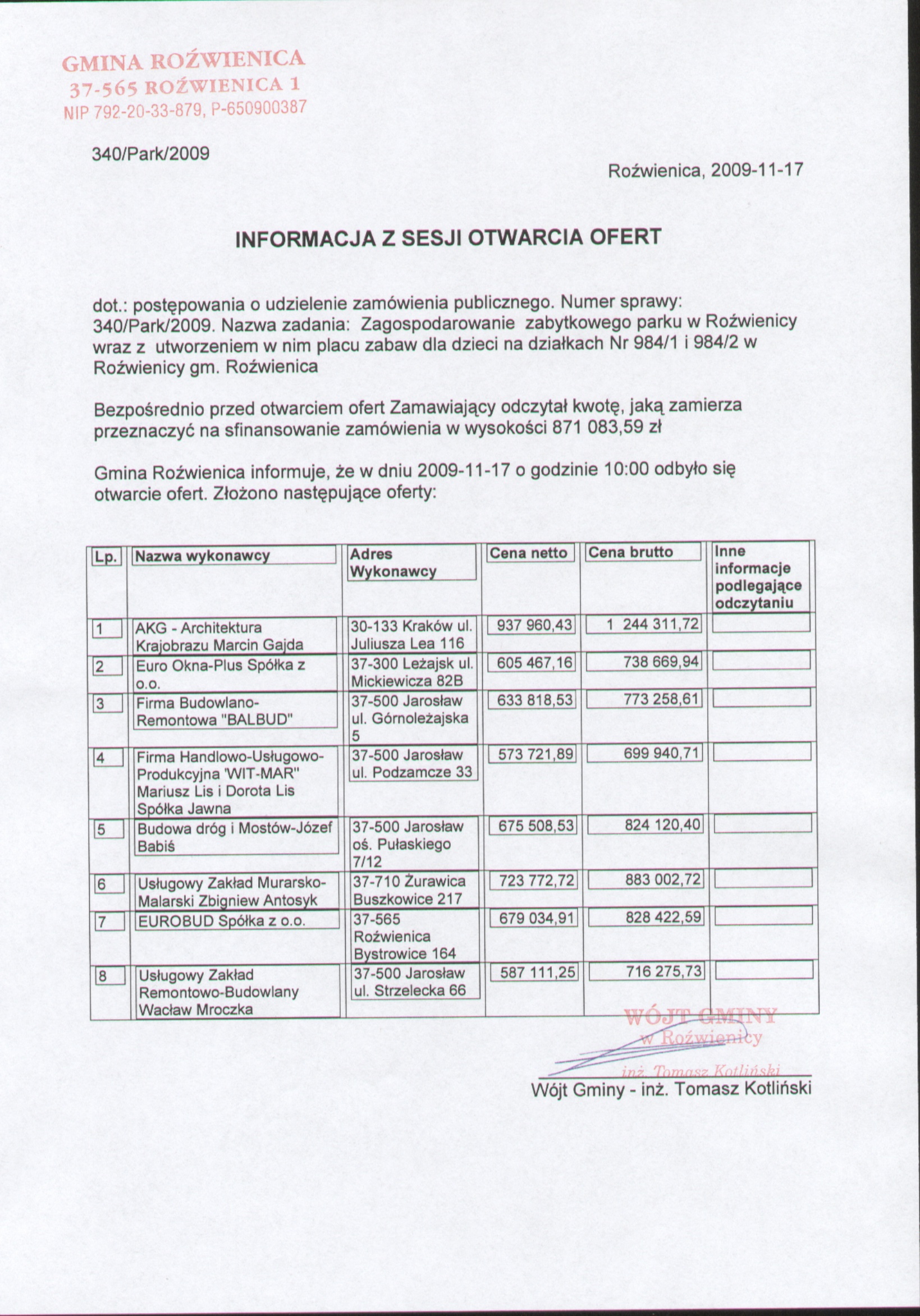 | Nazwa pozycji: | Informacja z sesji otwarcia ofert w przetargu Na Zagospodarowanie zabytkowego parku w Roźwienicy wraz z utworzeniem w nim placu zabaw dla dzieci |