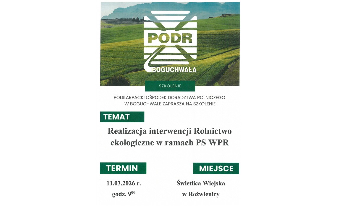 Zapraszamy zainteresowanych Mieszkańców Gminy na Szkolenie "Realizacja interwencji Rolnictwo ekologiczne w ramach PS WPR", które odbędzie się 11 marca br., o godz. 9.00 w Świetlicy Wiejskiej w Roźwienicy.
