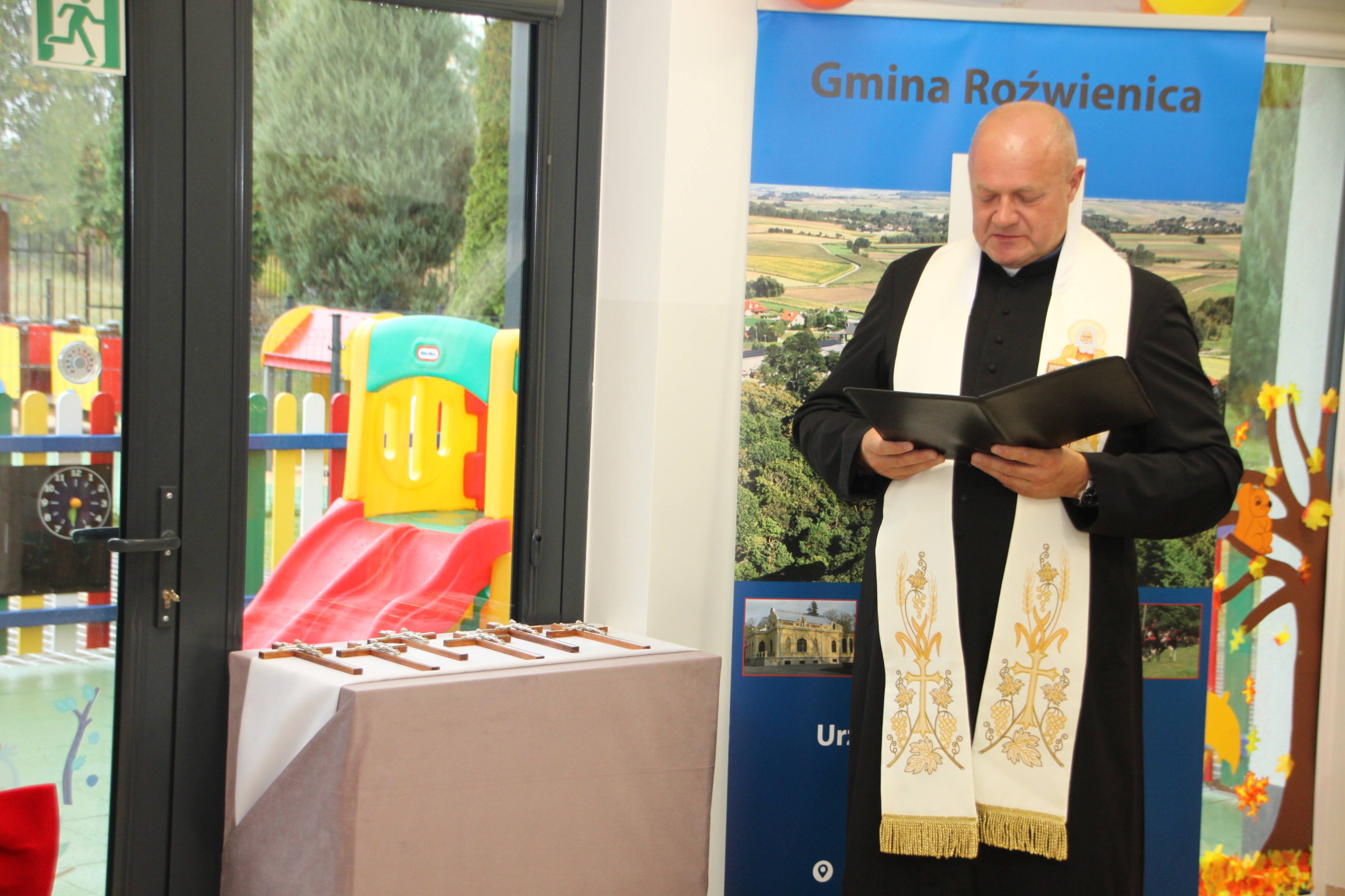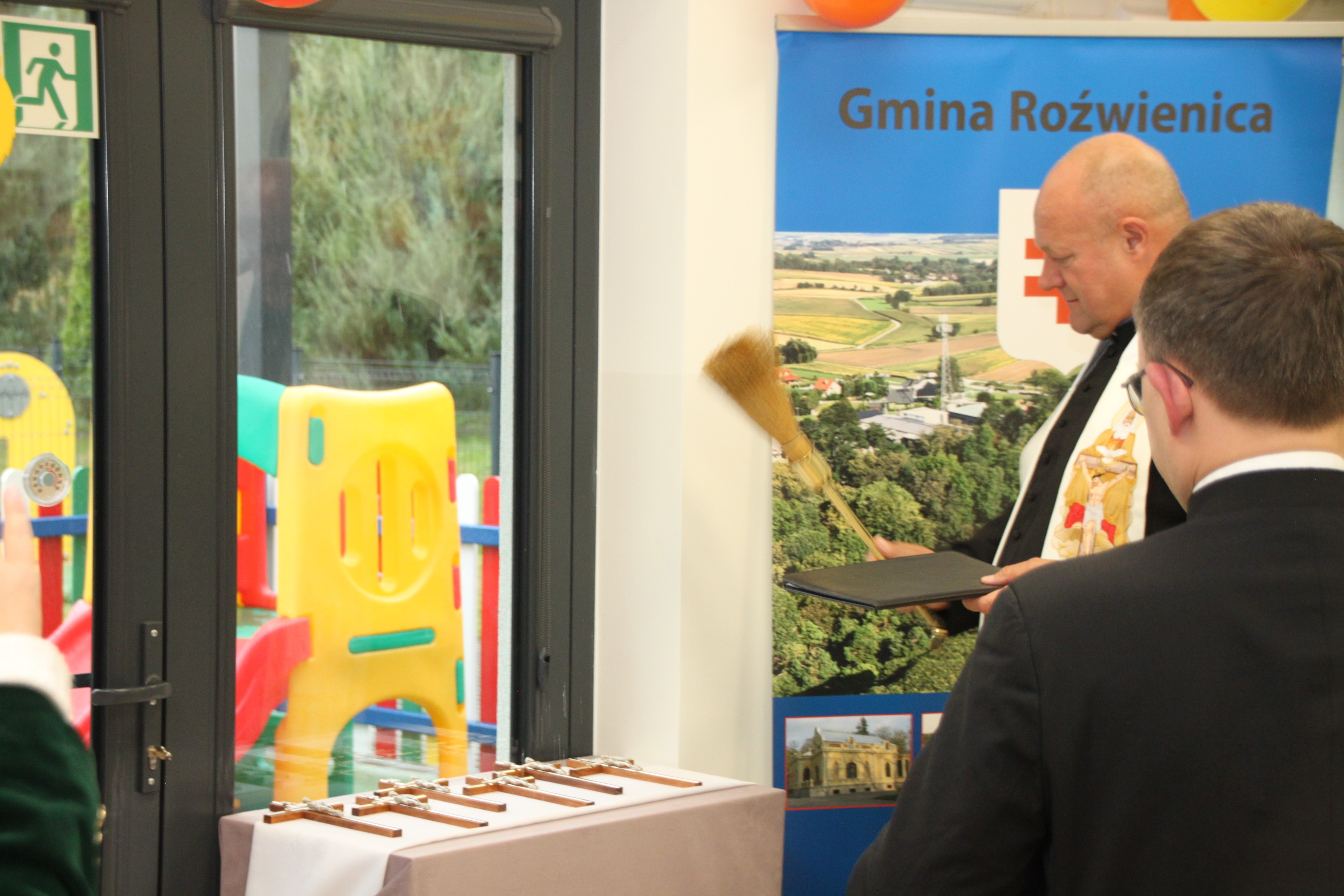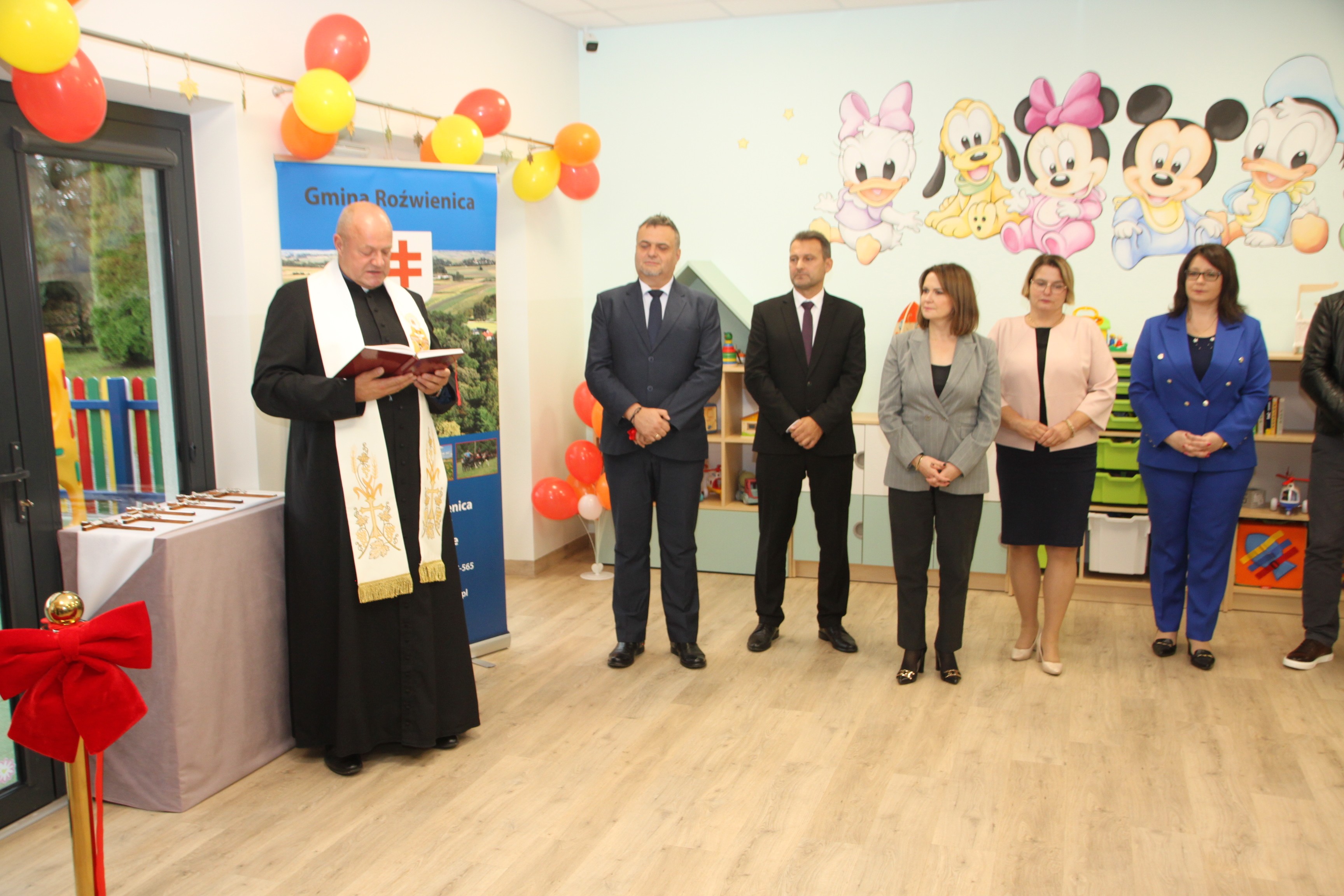 Poseł Anna Schmidt, Członek Zarządu Województwa Podkarpackiego Anna Huk, Wójt Gminy Roźwienica Tomasz Kud, Przewodniczący Rady Gminy Paweł Bąk, Proboszcz ks. Mirosław Mateja, wykonawca inwestycji Marek Kurpiel, Dyrektor żłobka Sylwia Mazur oraz przedstawicielka rodziców – Paulina Krupa. Po uroczystym przecięciu wstęgi księża Mirosław Mateja i Mateusz Sławiński dokonali aktu poświęcenia obiektu, przekazując również krzyże, które zawisną w salach żłobkowych.