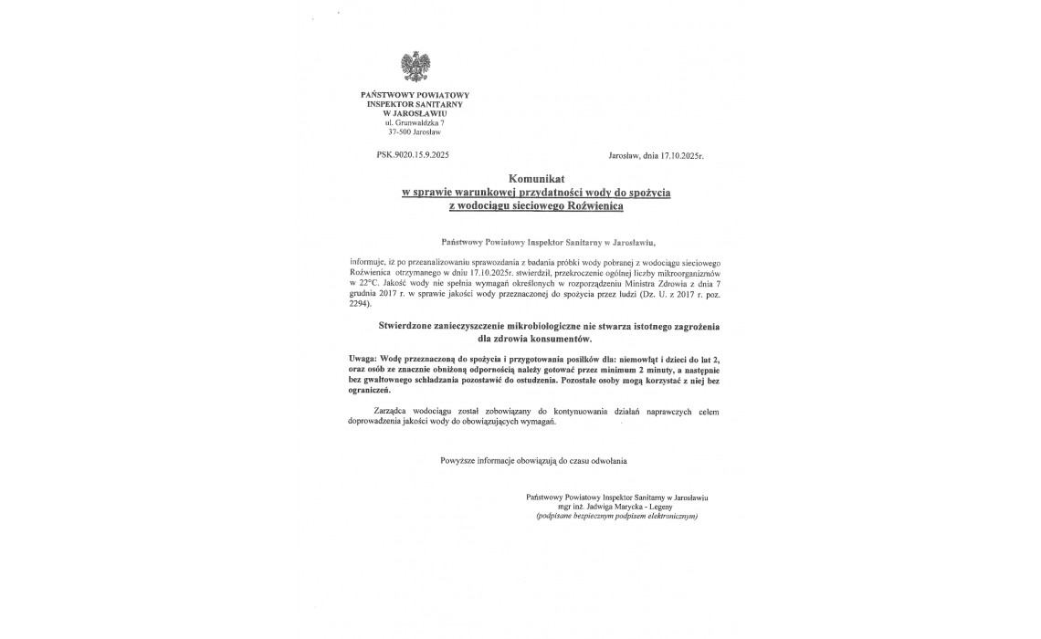 Komunikat Państwowego Powiatowego Inspektora Sanitarnego w Jarosławiu, znak PSK.9020.15.9.2025 z dnia 17 października 2025 r., w sprawie warunkowej przydatności wody do spożycia z wodociągu sieciowego Roźwienica.pdf