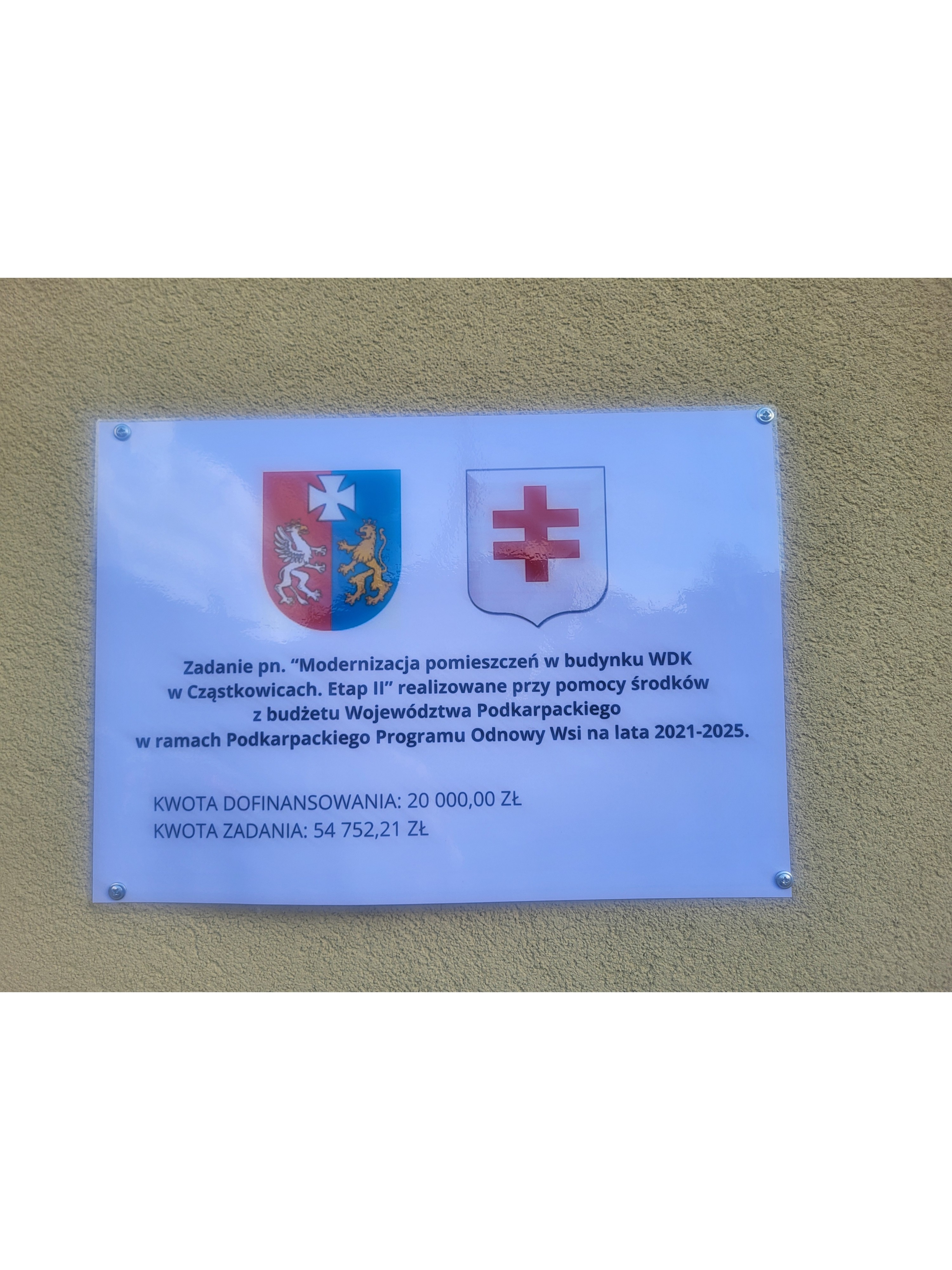 Zakończyły się prace remontowe w Wiejskim Domu Kultury w Cząstkowicach, które stanowiły drugi etap modernizacji tego ważnego dla mieszkańców obiektu. Inwestycja została zrealizowana dzięki wsparciu finansowemu z budżetu Województwa Podkarpackiego w ramach Podkarpackiego Programu Odnowy Wsi na lata 2021–2025, w zakresie działań służących realizacji Sołeckich Strategii Rozwoju Wsi. Na ten cel przyznano 20 000 zł dofinansowania, a pozostałą część kosztów pokryto z funduszu sołeckiego sołectwa Cząstkowice.