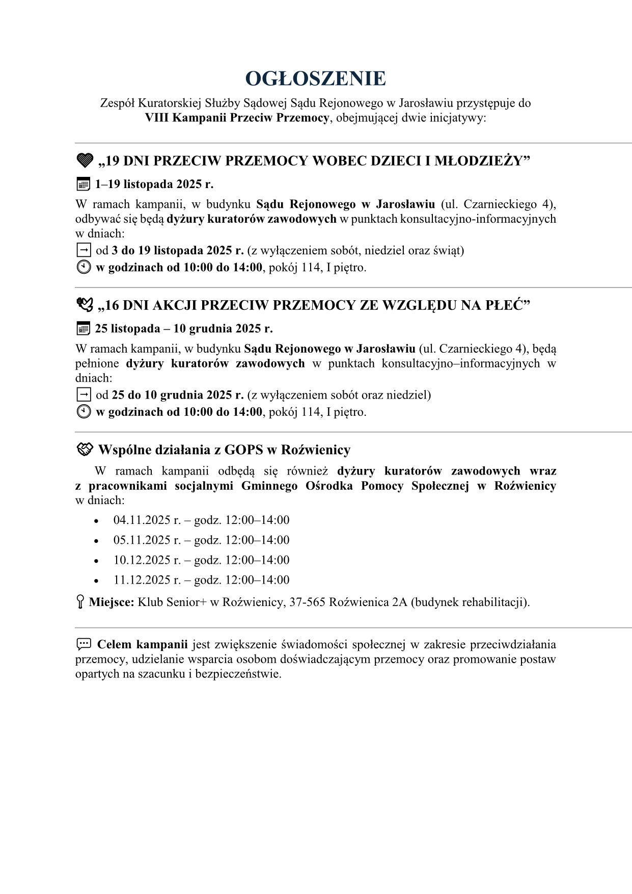 Zespół Kuratorskiej Służby Sądowej Sądu Rejonowego w Jarosławiu przystępuje do VIII Kampanii Przeciw Przemocy, obejmującej dwie inicjatywy: